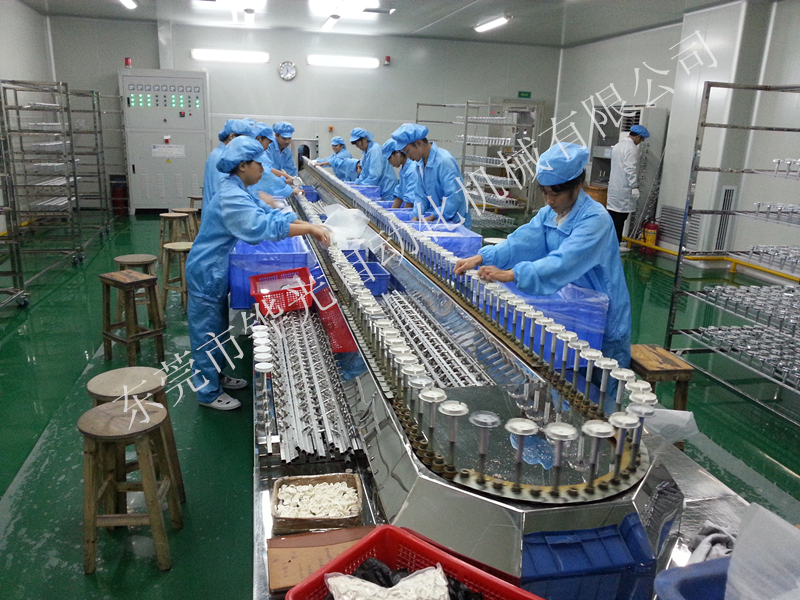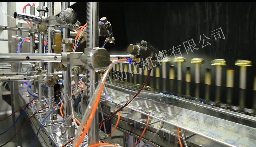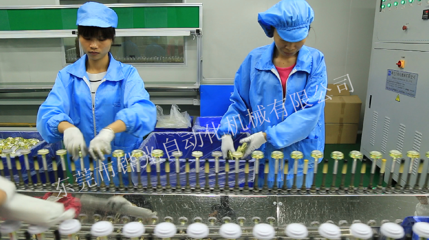 操作者在工作臺(tái)面的上料區(qū)手工將半成品瓶蓋,瓶子等工件套在夾具上,通過輸送傳動(dòng)鏈依次通過生產(chǎn)線的各個(gè)功能部件。