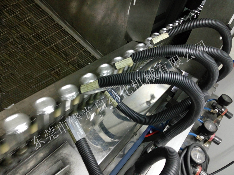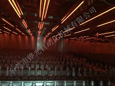 經(jīng)過火焰處理的基材通過輸送傳動(dòng)鏈進(jìn)入噴房,噴房內(nèi)的噴槍向其噴射涂料.同時(shí)基材受強(qiáng)制回轉(zhuǎn)系統(tǒng)的控制而產(chǎn)生自轉(zhuǎn),使基材表面獲得均勻的涂層。