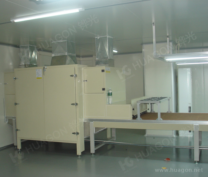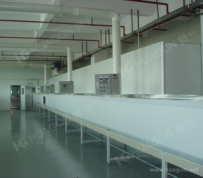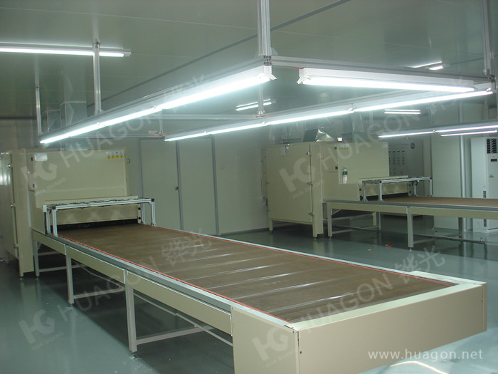 上料-手動(dòng)靜電除塵-素材預(yù)熱-多任務(wù)站手動(dòng)/自動(dòng)噴涂-靜置-隧道式烘烤-UV光固化-冷卻-下料